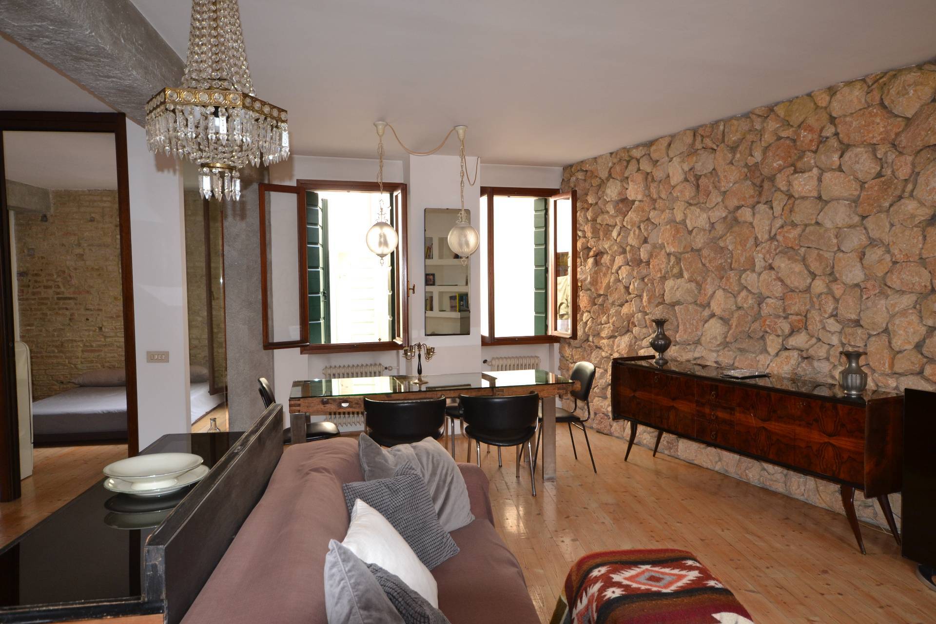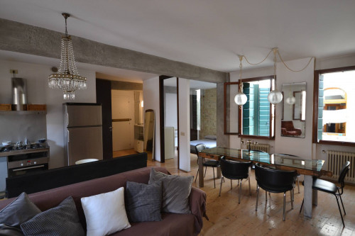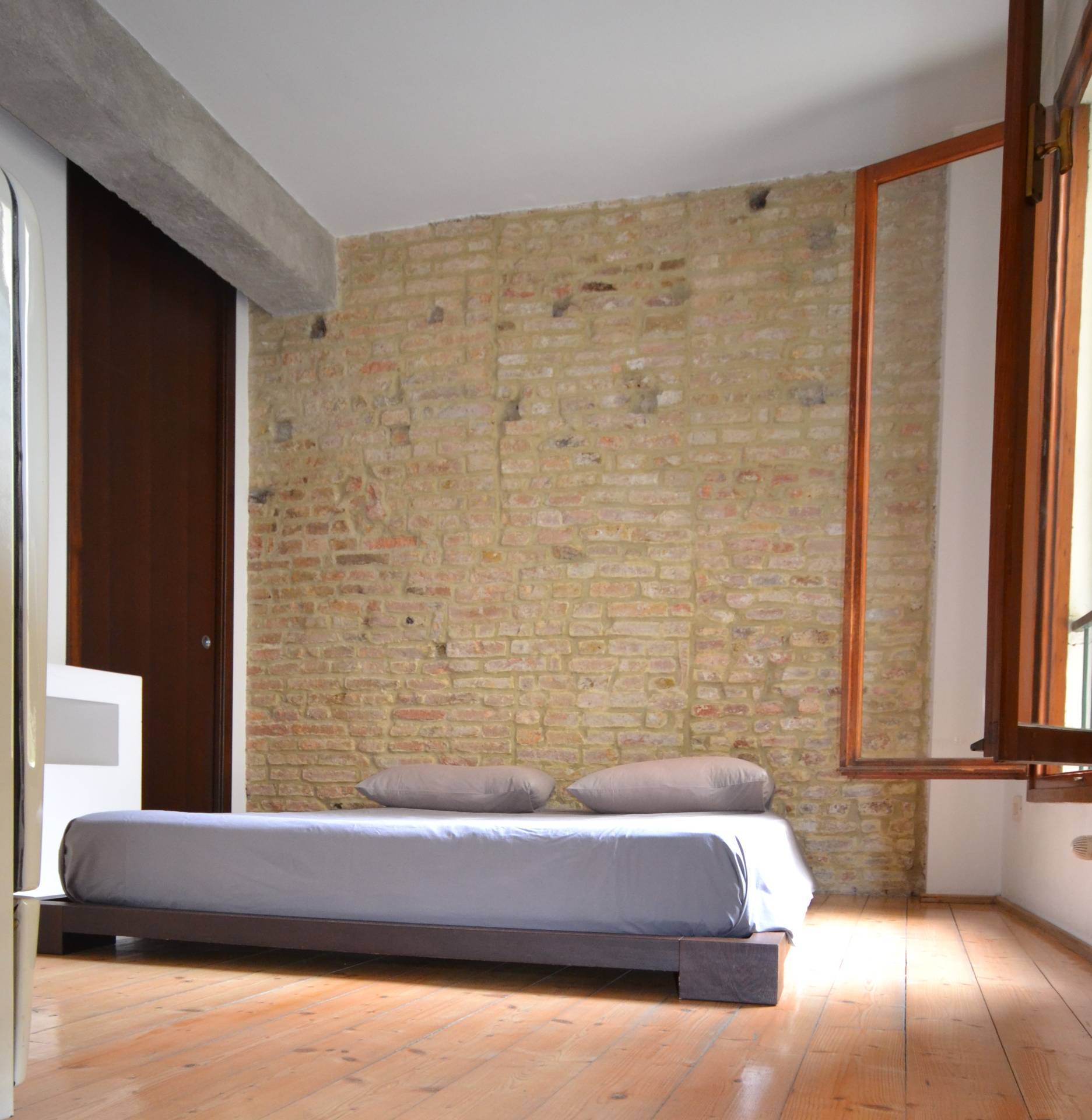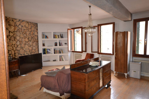 Appartamento bilocale in pieno centro storico a Treviso. L'immobile, posto al secondo piano di un edificio storico, è composto da un ampio locale (che accorpa ingresso, soggiorno, pranzo, angolo cottura), da una camera con adiacente cabina armadio finestrata e da un bagno. I locali sono molto luminosi e godono di affacci su piazza S. Vito e sui tetti degli edifici circostanti. Il riscaldamento, ottenuto mediante radiatori tradizionali, è alimentato da una caldaia a gas metano che serve due appartamenti dello stesso condominio. Le finiture sono particolari e rendono l'Appartamento accattivante e simpatico. A complemento dell'abitazione vi è al piano terra un piccolo magazzino in comproprietà (al 50%), dove si trova la caldaia, e dove è possibile collocare i bidoni dei rifiuti e una bicicletta.