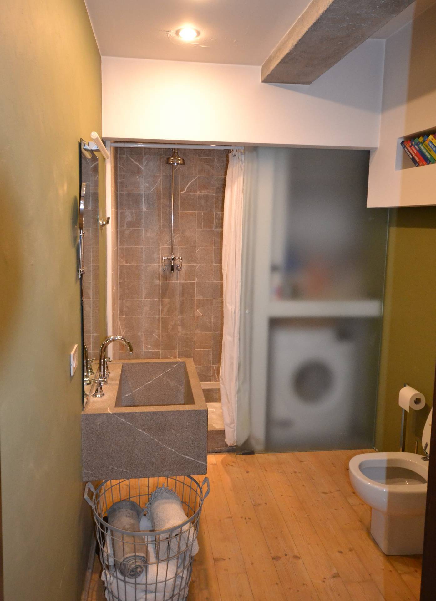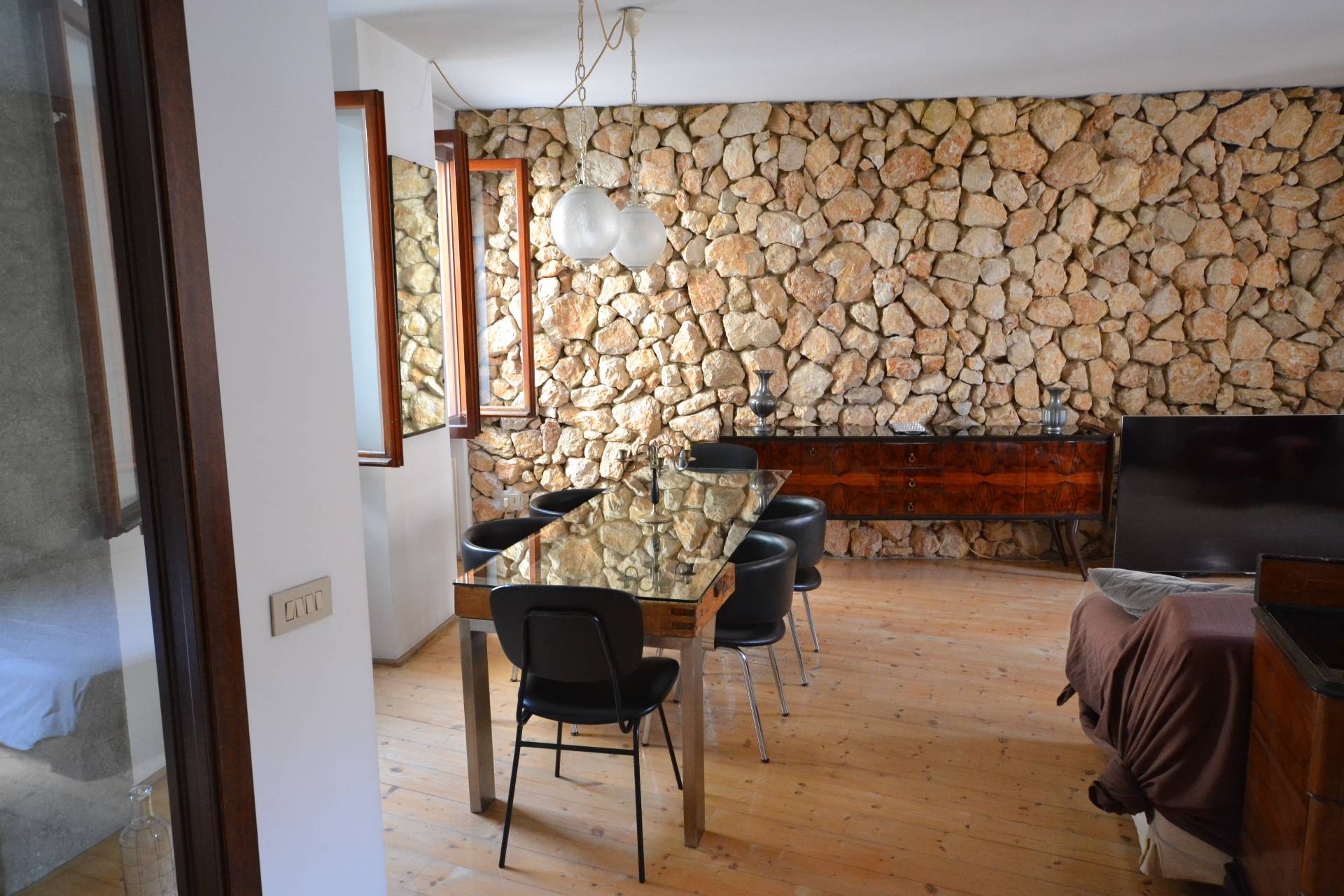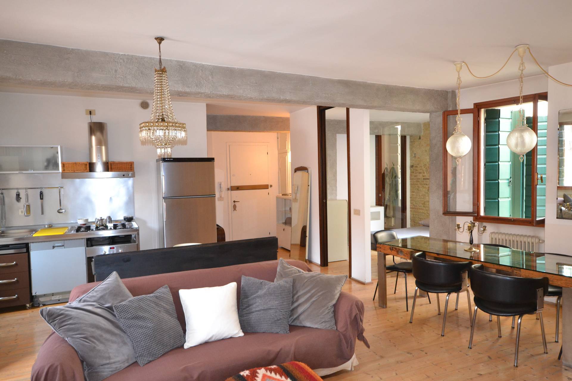Appartamento bilocale in pieno centro storico a Treviso. L'immobile, posto al secondo piano di un edificio storico, è composto da un ampio locale (che accorpa ingresso, soggiorno, pranzo, angolo cottura), da una camera con adiacente cabina armadio finestrata e da un bagno. I locali sono molto luminosi e godono di affacci su piazza S. Vito e sui tetti degli edifici circostanti. Il riscaldamento, ottenuto mediante radiatori tradizionali, è alimentato da una caldaia a gas metano che serve due appartamenti dello stesso condominio. Le finiture sono particolari e rendono l'Appartamento accattivante e simpatico. A complemento dell'abitazione vi è al piano terra un piccolo magazzino in comproprietà (al 50%), dove si trova la caldaia, e dove è possibile collocare i bidoni dei rifiuti e una bicicletta.
